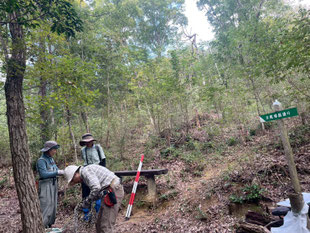 ロープを使って『3m×4m×5mの直角三角形の法則』で直角を作り、その辺を伸ばすことで10m四方の正方形を作る―のですが、一筋縄ではいきません。地面の凹凸で誤差が出たり、ピンを打つ場所がブッシュの中だったりで、4名の会員が悪戦苦闘の末、2時間がかりでようやく完成しました。実際の調査は次回からスタートします。